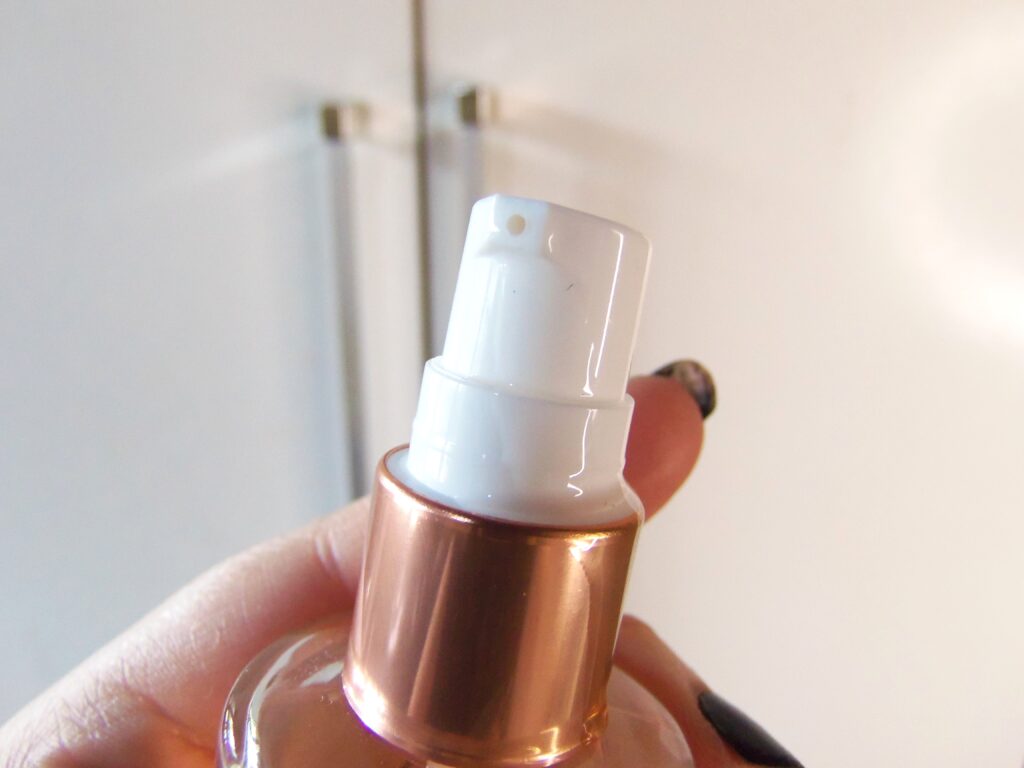 De vidro transparente feat. fosco com detalhes em dourado metálico, branco e preto. A tampa é em formato pump, o que evita o desperdício de produto e a saída é pequena. Ainda existem as tampas de puro design da embalagem e a de acesso a textura que é de rosquiar e facilmente aberta.