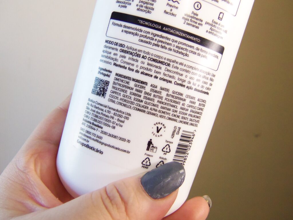 Pois bem! Como boa curiosa e produtora de conteúdo de cosméticos que sou, comprei o hidratante corporal Firmeza e Elasticidade com ácido hialurônico + colágeno. Segundo a marca, nutre, melhora a flacidez e mais firmeza em 2 semanas. Já adianto que comprei somente um frasco, usei como hidratante corporal mesmo e alguns aspectos só são possíveis de serem analisados a longo prazo e usando vários frascos.