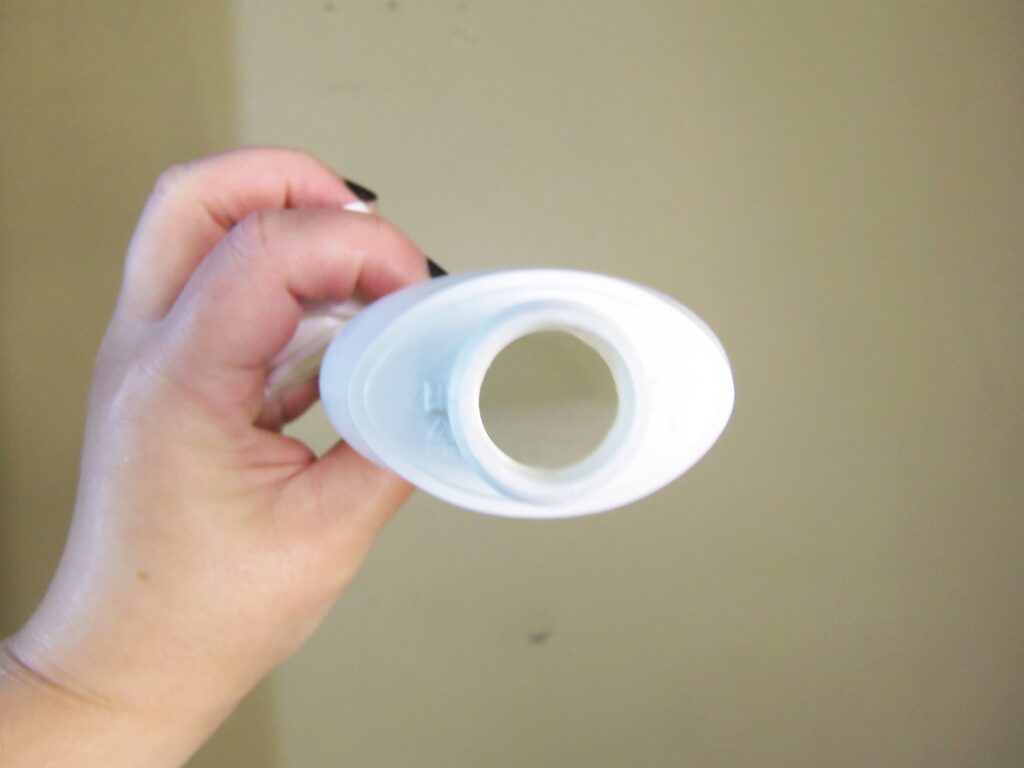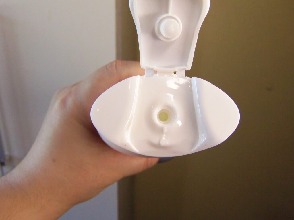 De plástico maleável com detalhes em branco, preto, vinho e tons variados de marrons. A tampa é abre e fecha e a saída do produto é média. Ainda existe a tampa de acesso a textura que é de rosquear e facilmente aberta.