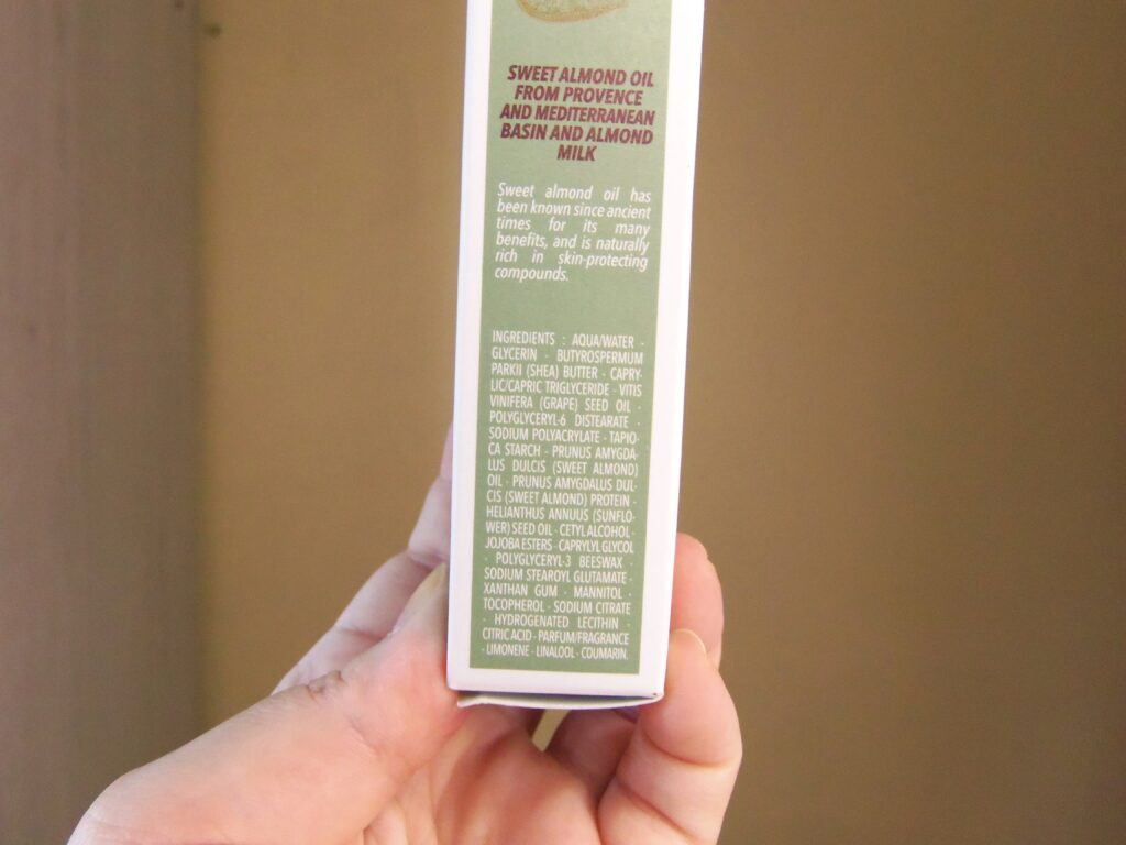 A fragrância é puramente de amêndoas com um fundo de karité clássico e inunda o ambiente ainda espalhando nas mãos, secando, fica rente a pele por algum tempo até ir sumindo e dando lugar somente aos cuidados com a região.