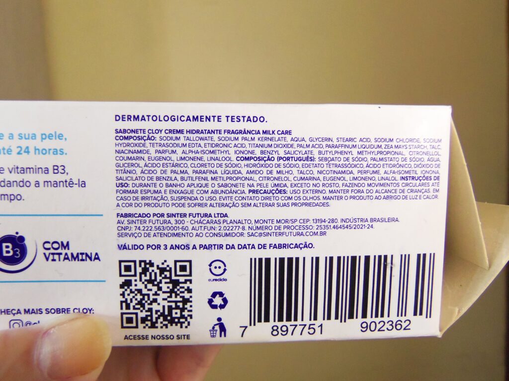 As informações gerais do item e os ingredientes são facilmente encontrados e lidos na parte de trás da caixa de papelão que vem protegendo o produto e também no site oficial da marca. Já como item em si só vem o nome da Cloy em um dos lados.