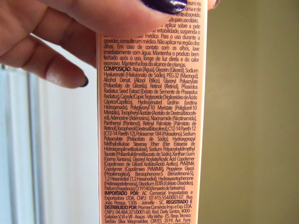 Textura leve, fluída e amarelo queimado indo para o transparente. Fácil aplicação. Deixa o rosto renovado, bem cuidado e hidratado. Rentabilidade baixa indo para a média.