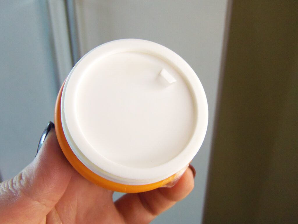 De pote com detalhes em laranja, preto e branco. A tampa é de rosquear, e também a mesma de acesso a textura, e a saída do produto é grande, sendo necessário uma espátula ou os dedos para retirar o produto.