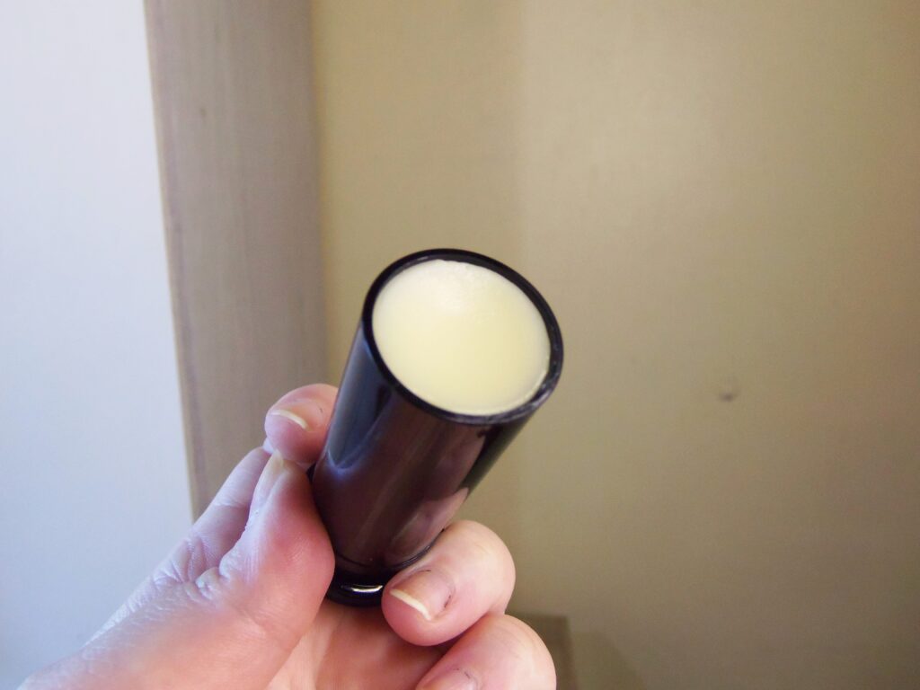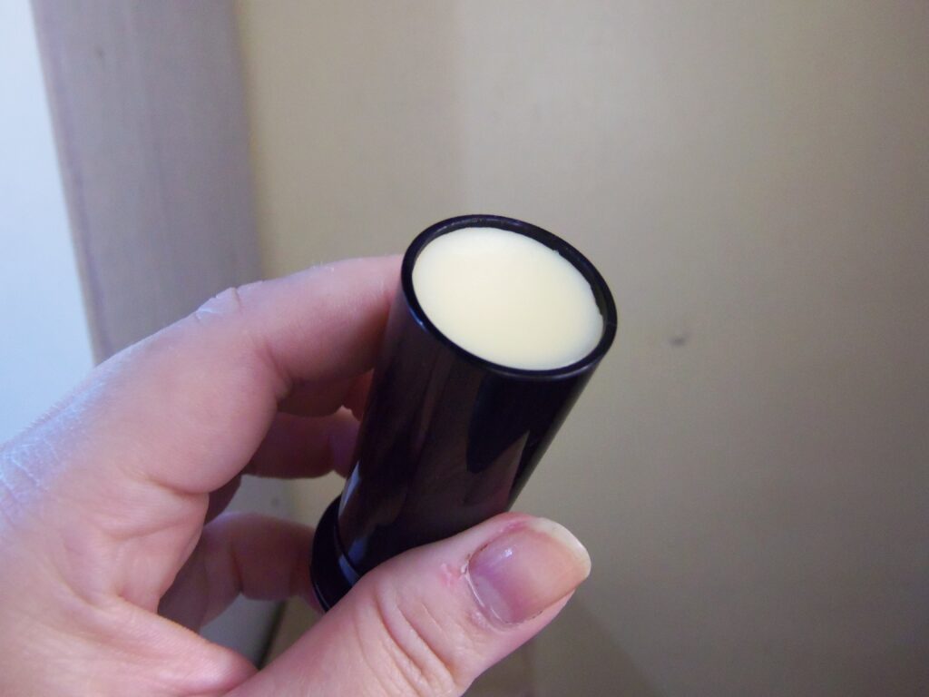 Em stick estilo hidratante labial clássico com detalhes em preto e branco. A tampa abre e fecha, inclusive é a mesma de acesso a textura, e é necessário ir rosqueando embaixo para a textura ir subindo.