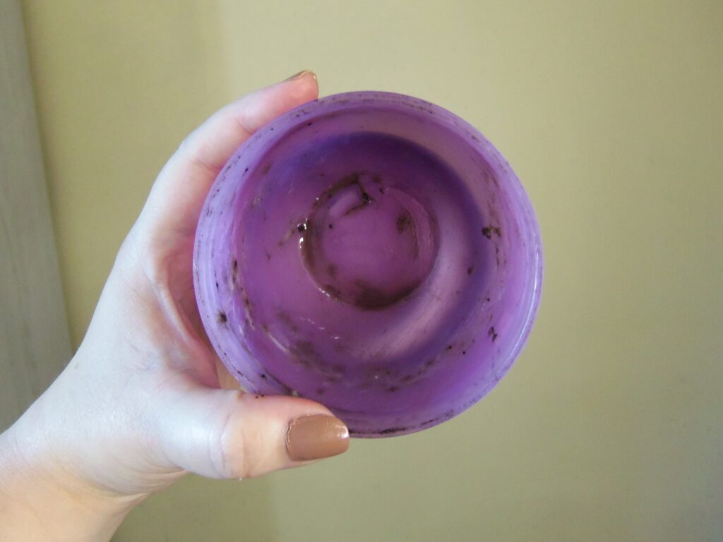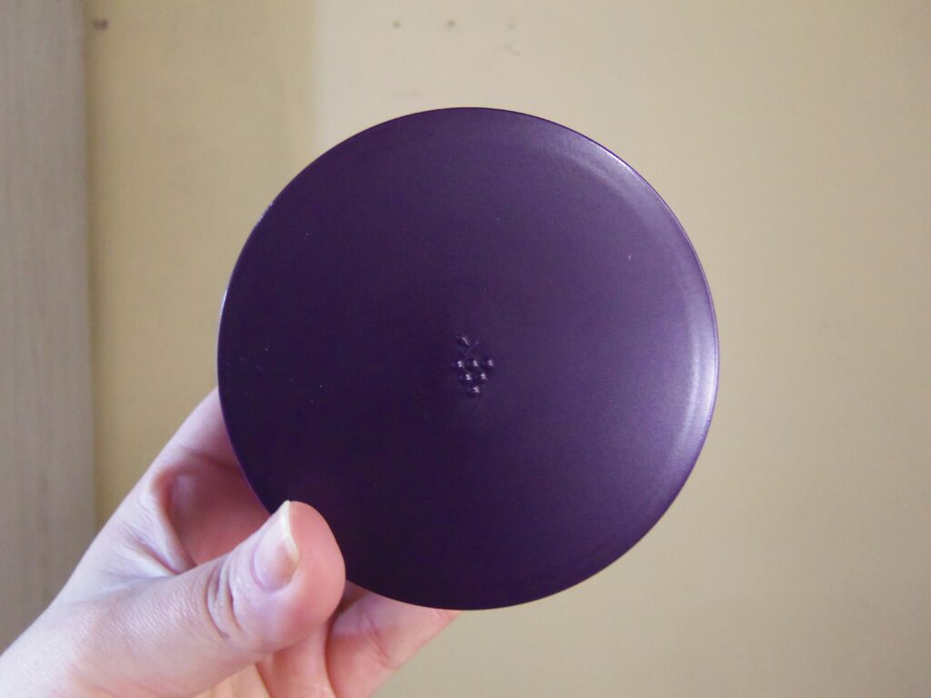 De pote transparente com detalhes em variados tons de roxo feat. vinho, branco e preto. A tampa é de rosquear e também a mesma de acesso a textura e a saída do produto é grande, sendo necessário uma espátula ou os dedos.