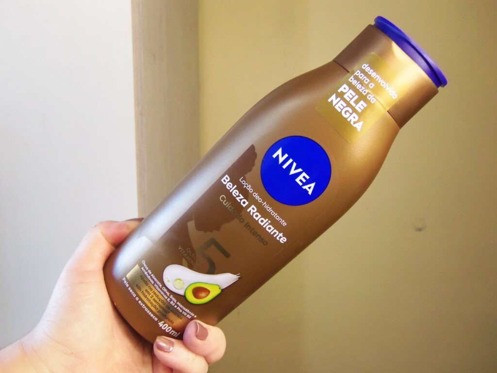 E daí que a Nivea lançou hidratantes faciais e corporais para peles negras. Depois de um tempo e como boa intrometida que sou, me joguei na variação Beleza Radiante 5 Óleos + Vitaminas. Segundo a marca, o produto é indicado para peles secas e extrassecas e os óleos são de abacate, oliva, soja, macadâmia e amêndoas.