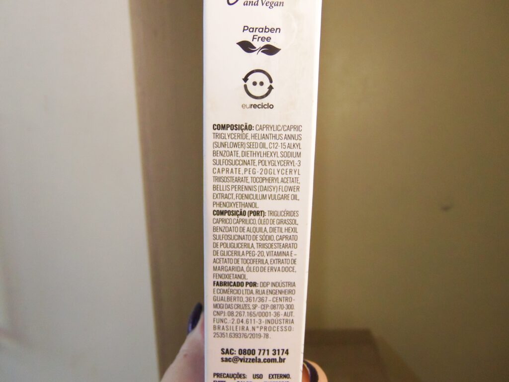 As informações gerais de uso e os ingredientes são facilmente encontrados e lidos na parte de trás da caixa de papelão que vem protegendo o produto e possui as mesmas tonalidades do frasco e também no site oficial da marca. Já na embalagem como um todo só constam descrições gerais do item.