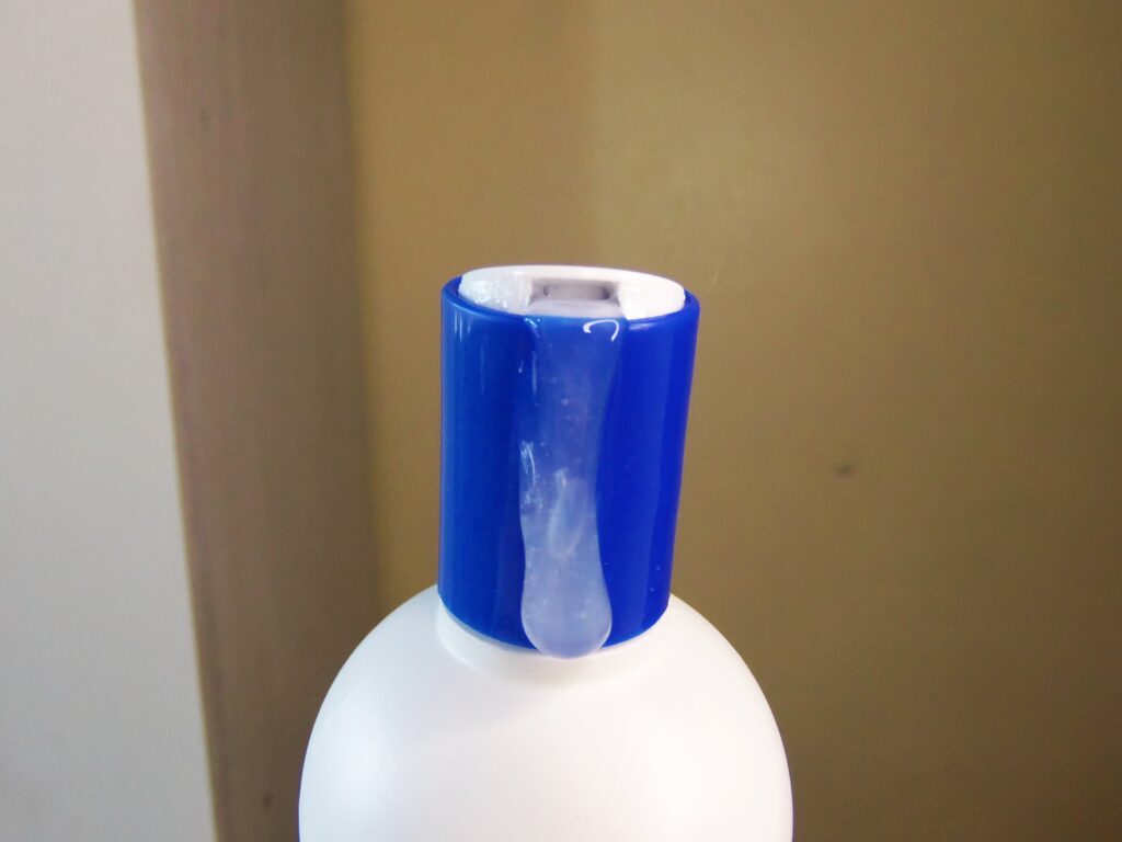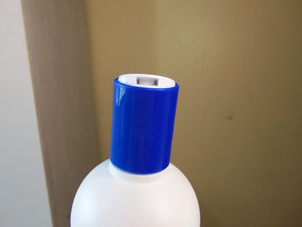 De plástico com detalhes em branco, vermelho, variados tons de azuis e amarelo. A tampa abre e fecha e a saída do produto é pequena. Já a tampa de acesso a textura é de rosquear, facilmente aberta e a saída do produto é grande.