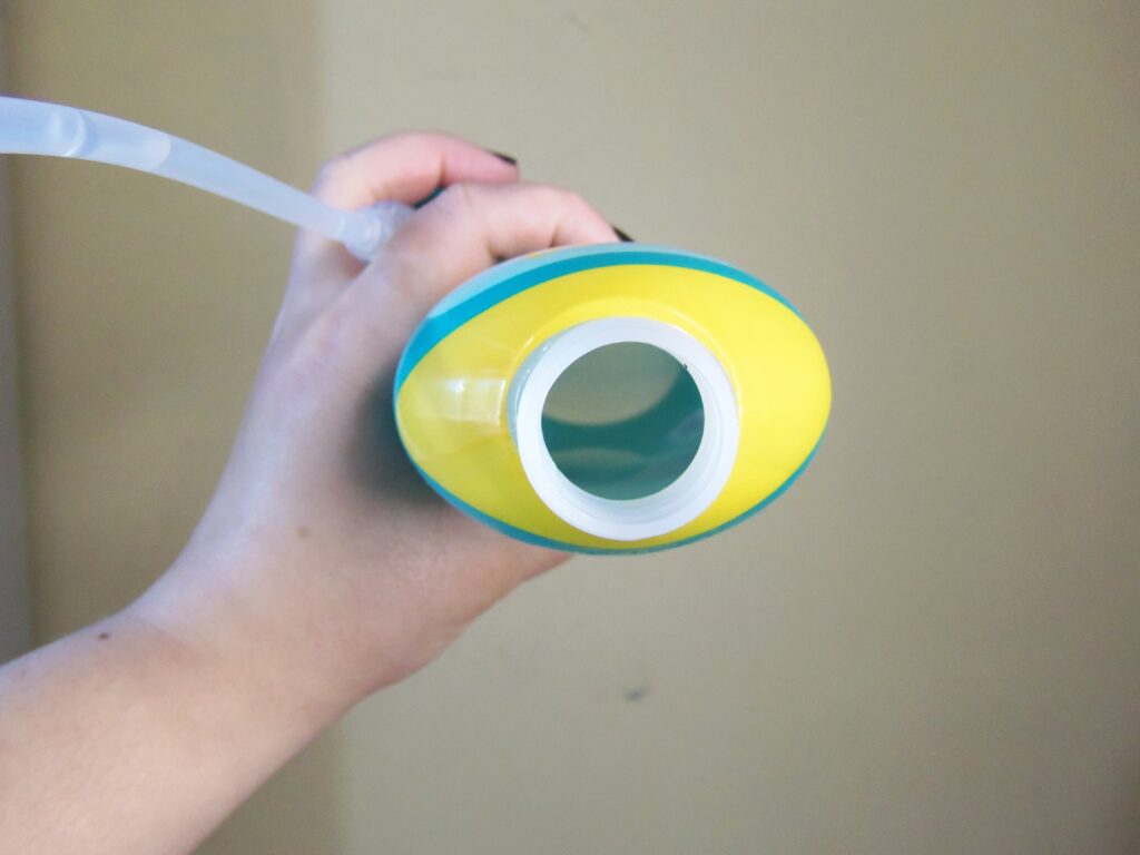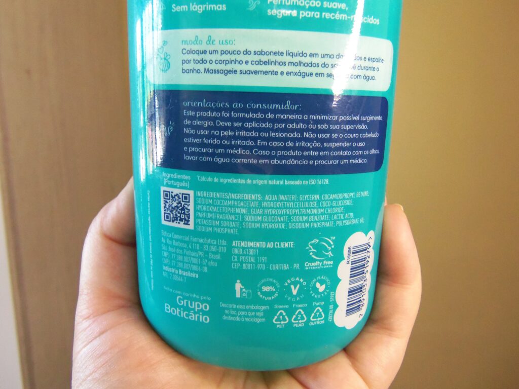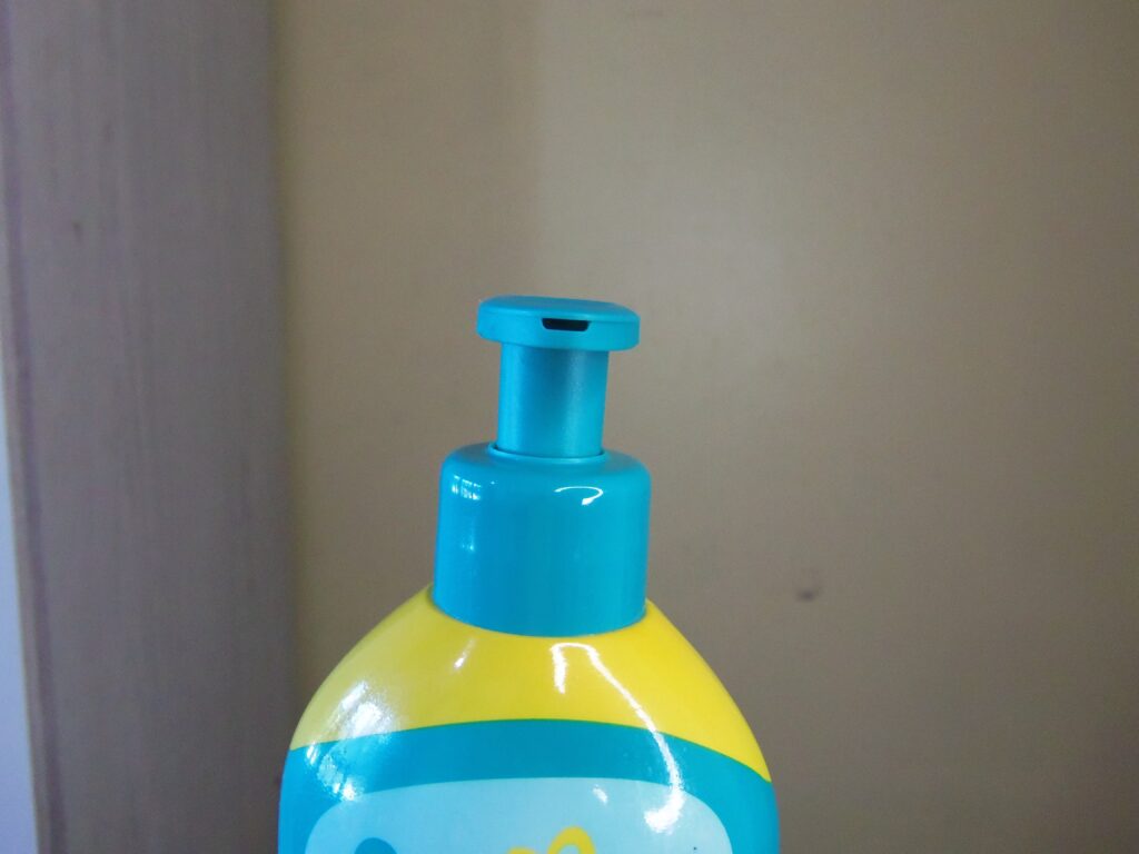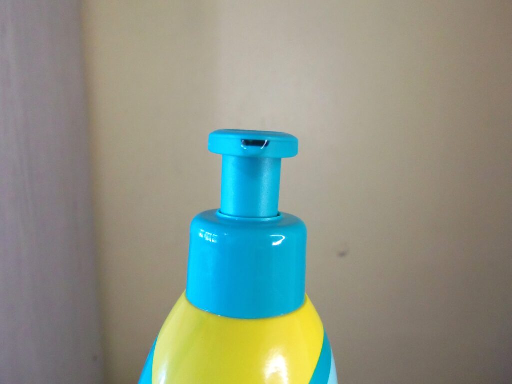 De plástico transparente com detalhes em variados tons de verdes, amarelo, branco e azul escuro e com o desenho de um pequeno patinho na parte de baixo na frente da embalagem. A tampa é em formato pump, o que evita o desperdício de produto e a saída é média. Ainda existe a tampa de acesso a textura que é de rosquear e facilmente aberta.