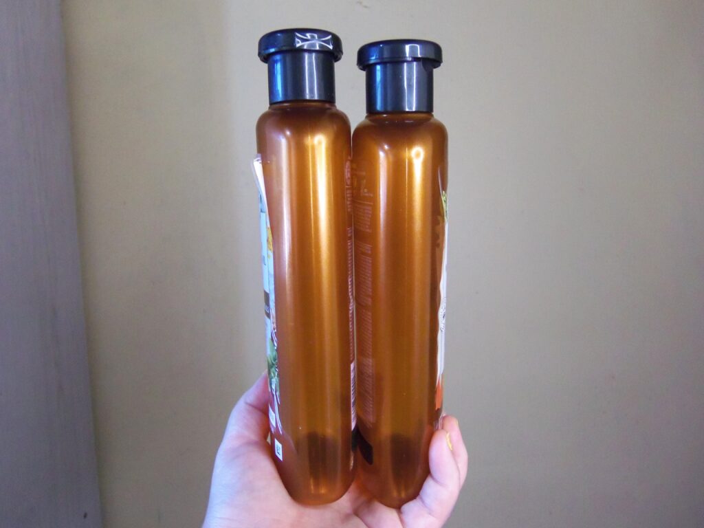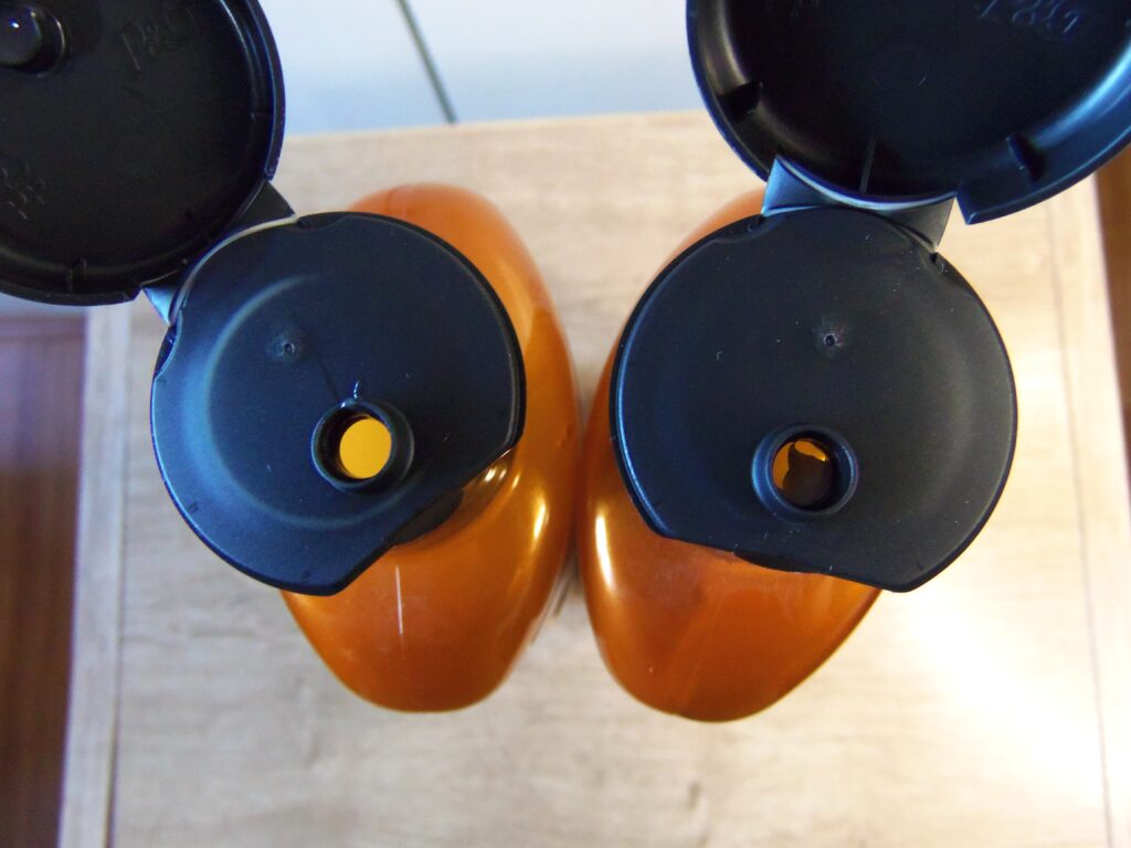 Ambos são de plásticos transparentes com detalhes em marrom claro fechado, preto, branco, variados tons de verdes, dourado metálico e com flores e frutas desenhadas nas partes das frentes dos frascos. As tampas abrem e fecham e as saídas dos produtos são médias. Ainda existem as tampas de acessos as texturas que são de rosquear e facilmente abertas.