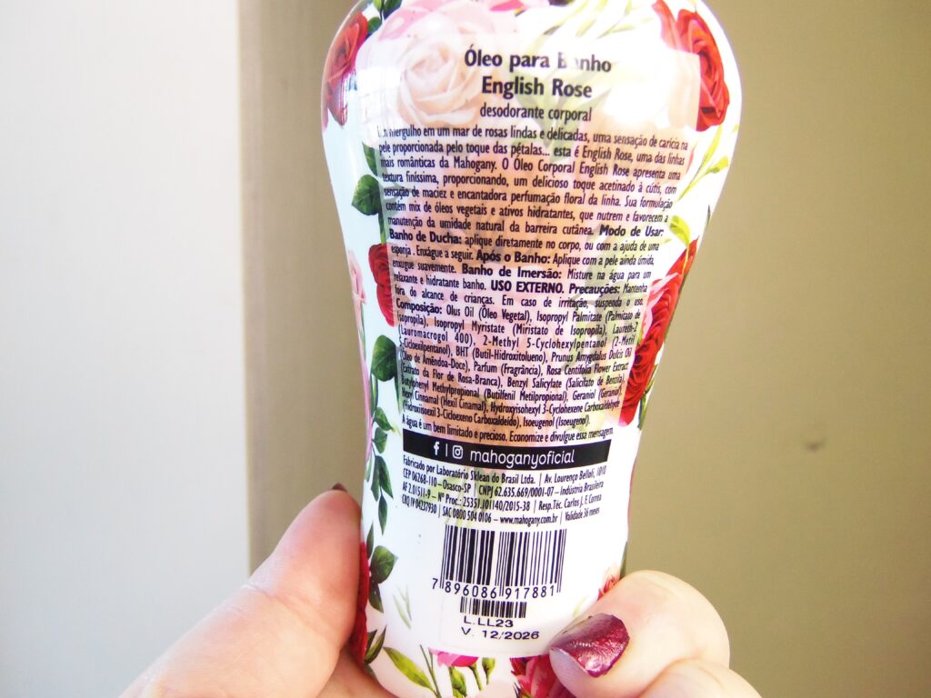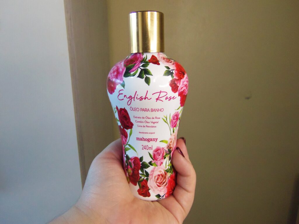 Ainda nas minhas compras no site da Mahogany, me joguei no óleo para banho English Rose, ou popularmente conhecido como óleo corporal, e possui óleo vegetal e extrato de óleo de rosa nos seus ingredientes.