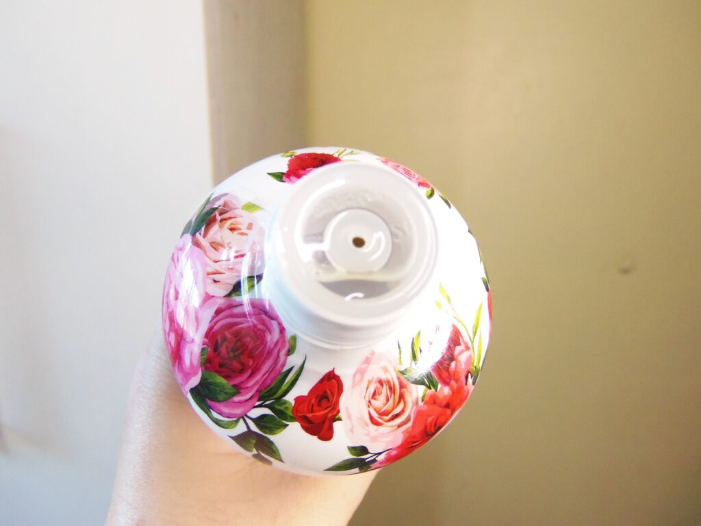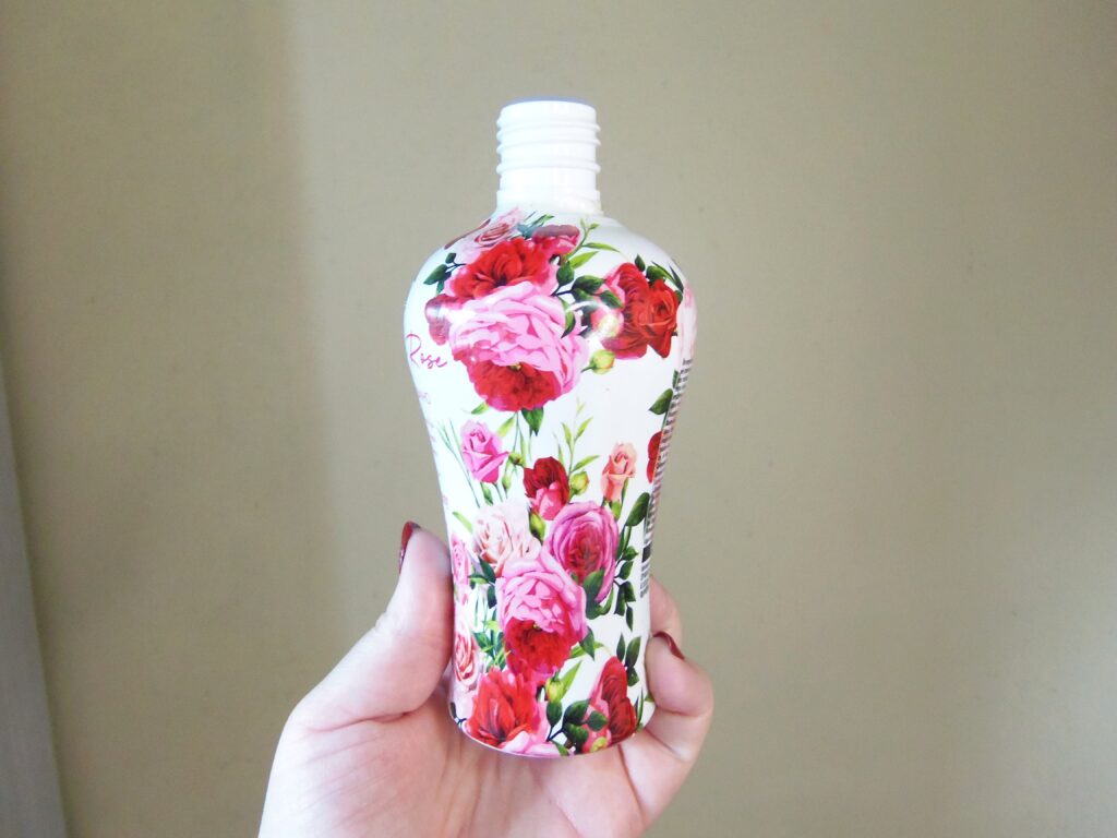 De plástico indo para o resistente com detalhes em branco, preto, vinho, dourado metálico e com rosas desenhadas por todo o frasco. A tampa é de rosquear e a saída do produto é pequena. Para acessar a textura é necessário retirar o lacre da saída do produto e é facilmente aberto. Inclusive, só fui descobrir esta informação quando já tinha tirado todas as fotos finais e estava fazendo este post. E sim! Também acho super lamentável!