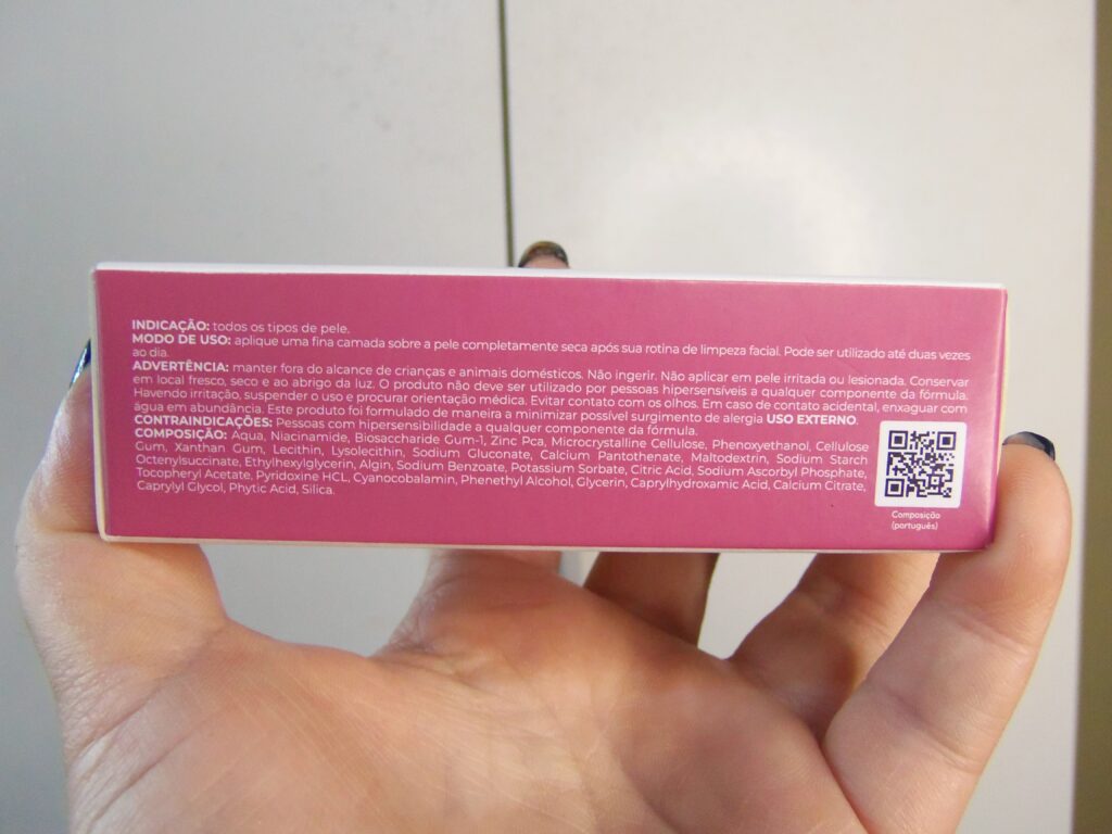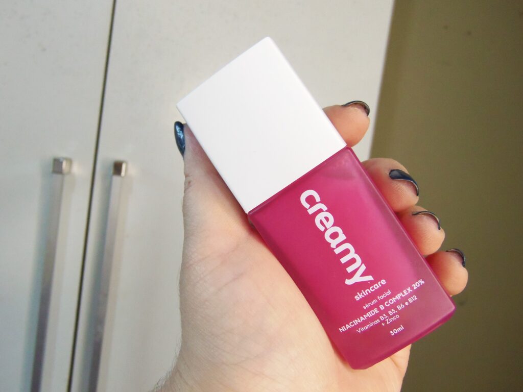 E daí resolvi conhecer o sérum facial de niacinamida da Creamy. Segundo a marca, além do ativo, ele também possui b complex 20%, vitamina B12, zinco e pantenol.