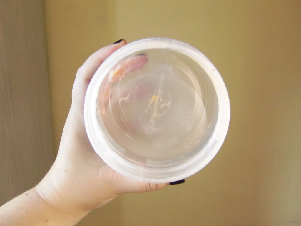 De plástico transparente com detalhes em branco, preto e variados tons de laranja. A tampa é de rosquear, inclusive é a mesma de acesso a textura, facilmente aberta e a saída do produto é grande, sendo necessário uma espátula ou os dedos para retirar o produto.