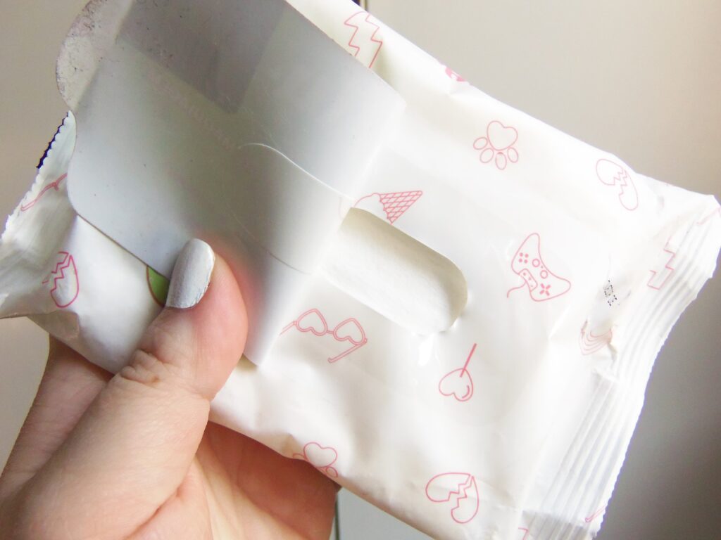 Os itens vem dentro de uma embalagem de plástico com detalhes em branco, variados tons de rosas, verde limão e com desenhos aleatórios espalhados por todo o frasco. Para acessar a textura feat. retirar os lenços é ncessário abrir o lacre que se encontra no meio da embalagem.