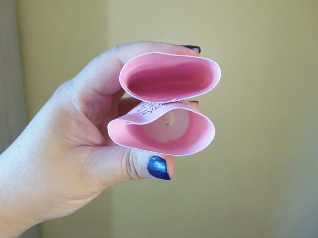 Em bisnaga de plástico com detalhes em rosa, preto e com uma flor rosa desenhado em branco na parte da frente do frasco. A tampa abre e fecha e a saída do produto é pequena. Já a tampa de acesso a textura é de rosquear, pelo menos eu não consegui abrir e usei o restante do creme cortando a embalagem no meio.