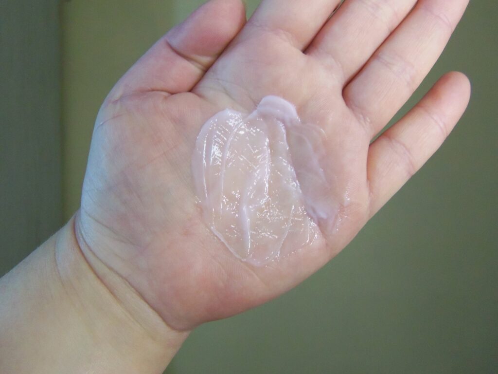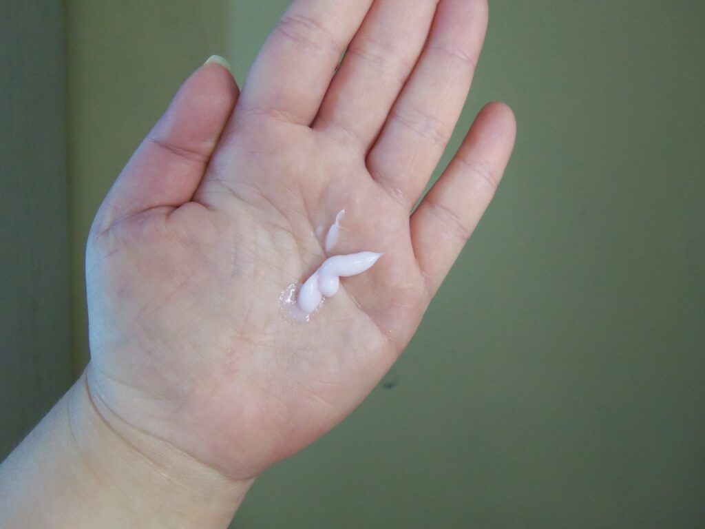O mesmo possui textura cremosa, rosa claro indo para o branco e consistente que torna-se um pouco mais leve quando aplicado nas mãos. Um pouco é suficiente para utilização e a absorção depende da quantidade colocada.