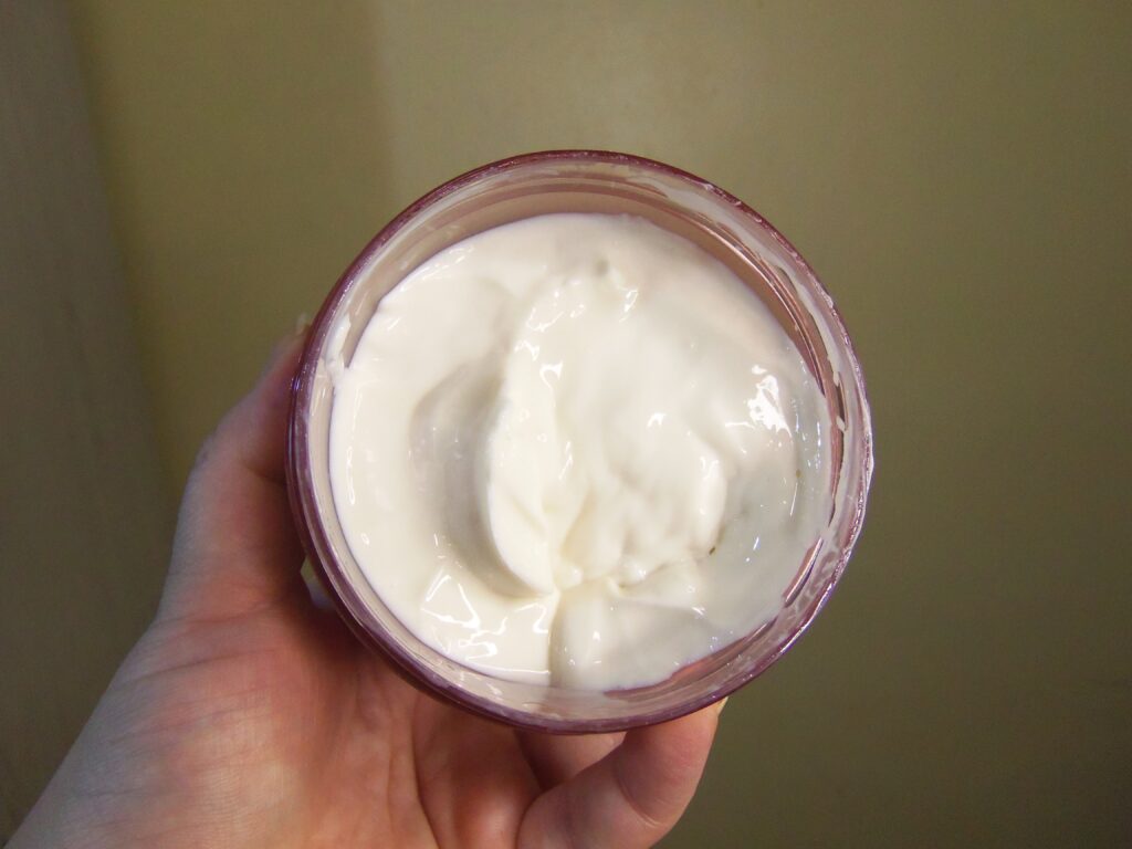 O mesmo possui textura branca, cremosa e um consistente indo para o leve no corpo, um pouco é suficiente para utilização, a absorção é rápida, independente da quantidade colocada e é necessário uma espátula ou os dedos para retirar o produto.