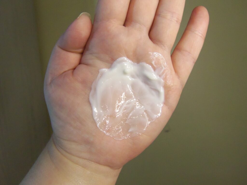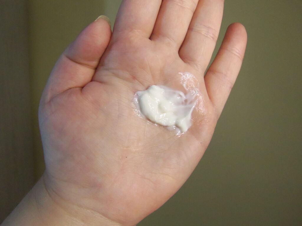 Em todos os momentos e sempre depois do banho, retirava um pouco do creme com os dedos mesmo e ia espalhando pelas áreas escolhidas do corpo externo com movimentos circulares por algum tempo até a textura sumir totalmente ou quase. No meu caso, era a pele corporal inteira, menos pés, mãos e rosto. Ou seja: Do peito até as panturrilhas.