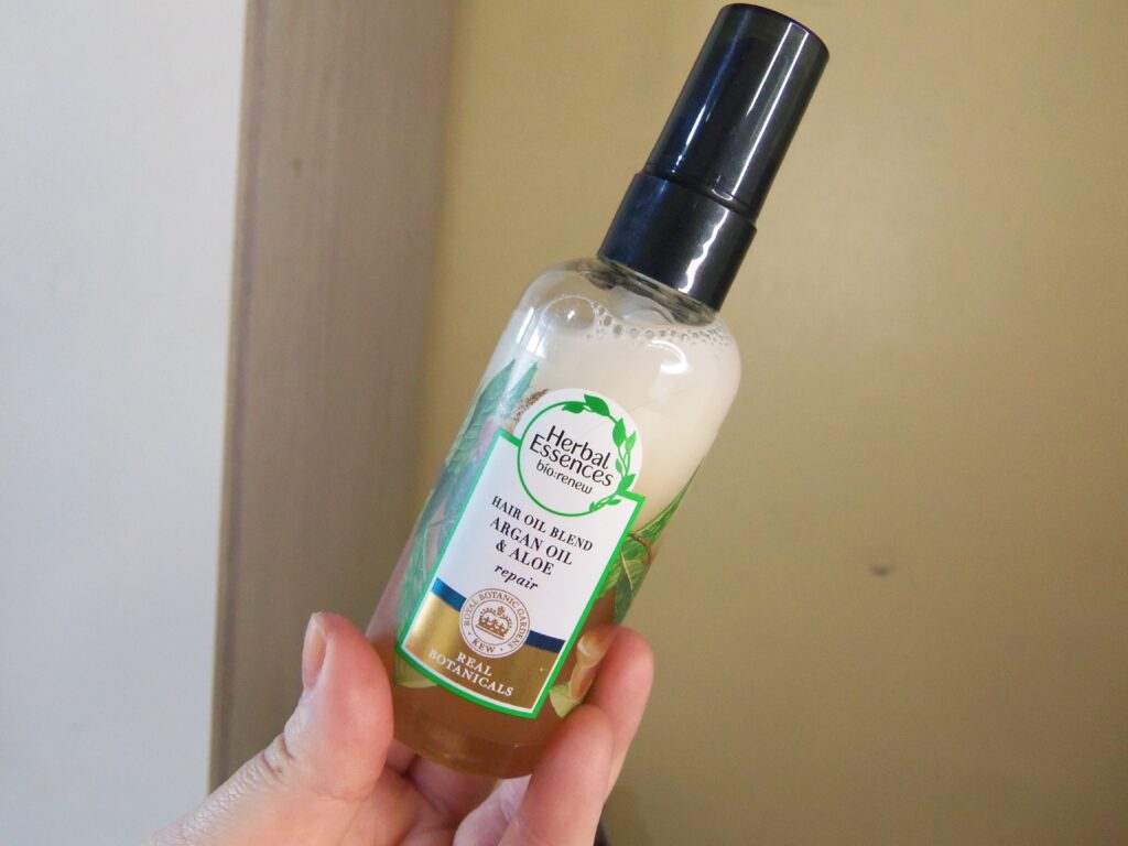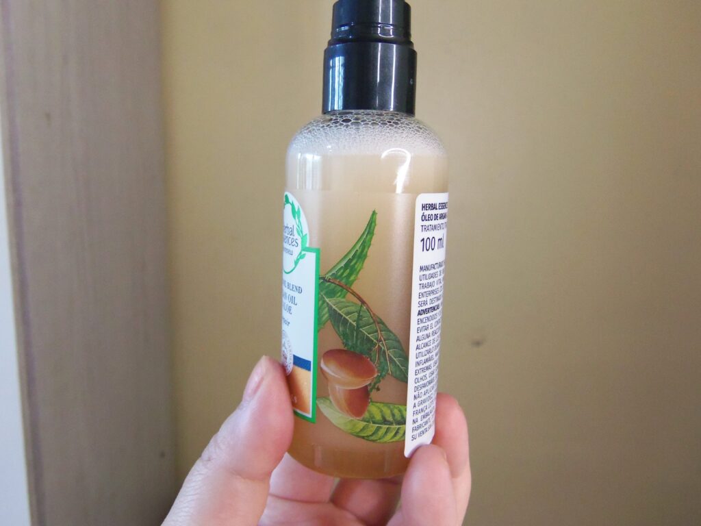 Já faz bastante tempo que tenho curiosidade em usar algum óleo capilar bifásico. E isto aconteceu quando me joguei no hair oil blend de argan e aloe da Herbal Essences.