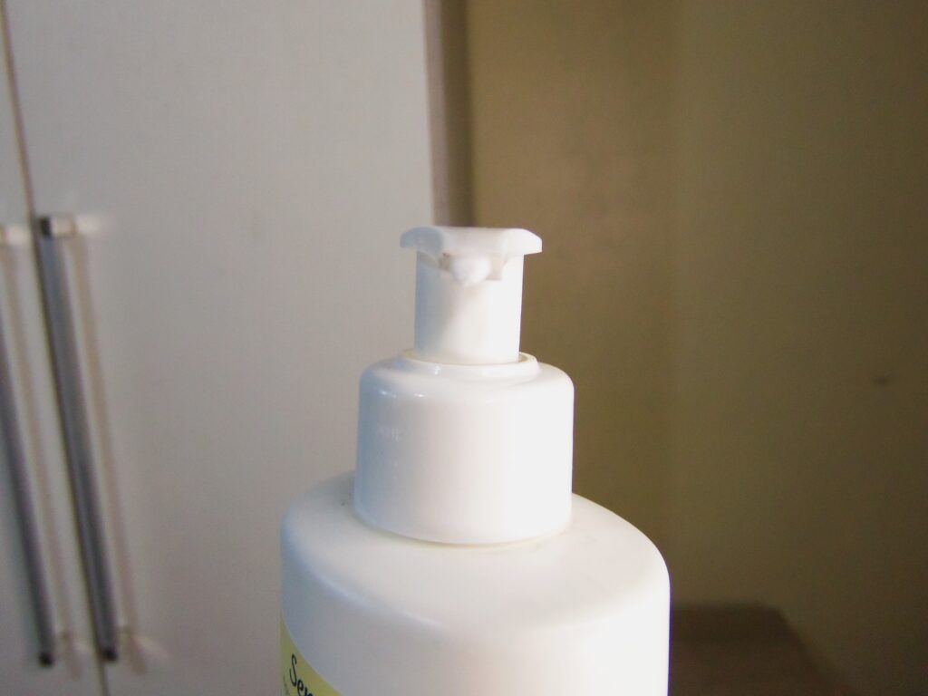De plástico com detalhes em branco, azul escuro e amarelo claro. A tampa é em formato pump e a saída do produto é média. Ainda existe a tampa de acesso a textura que é de rosquear e facilmente aberta.
