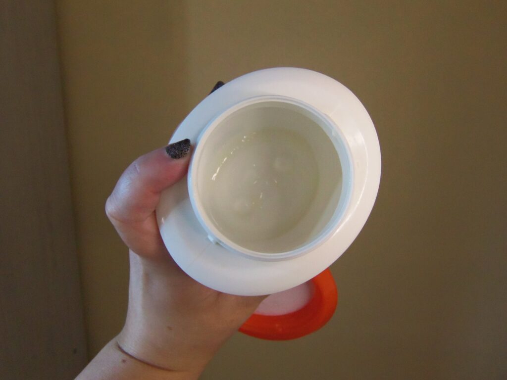 Pote de plástico resistente com detalhes em branco, preto, cinza metalizado e variados tons de laranja. A tampa é de rosquear (e também a mesma de acesso a textura) e a saída do produto é grande, sendo necessário uma espátula ou os dedos para retirar a textura.