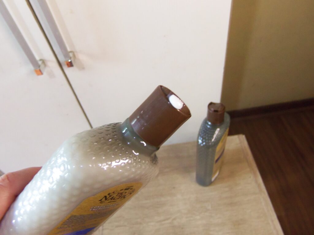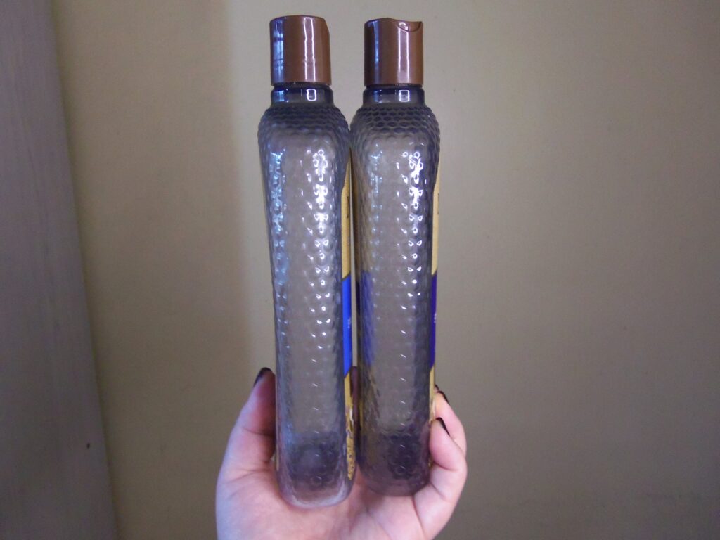 Ambos são de plásticos transparentes com detalhes em variados tons de marrom e dourado, azul claro, branco, preto e tem os desenhos de abelhas centralizadas na frente dos frascos. As tampas abrem e fecham e as saídas dos produtos são médias. Já as tampas para acessar as texturas são de rosquear e facilmente aberta.