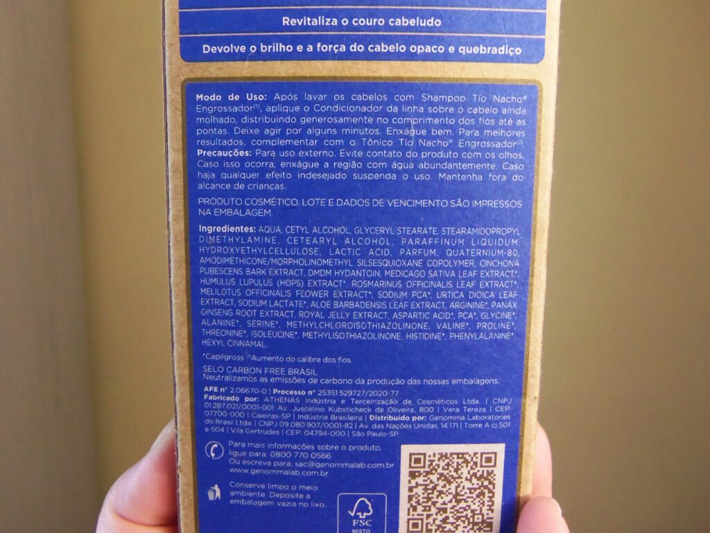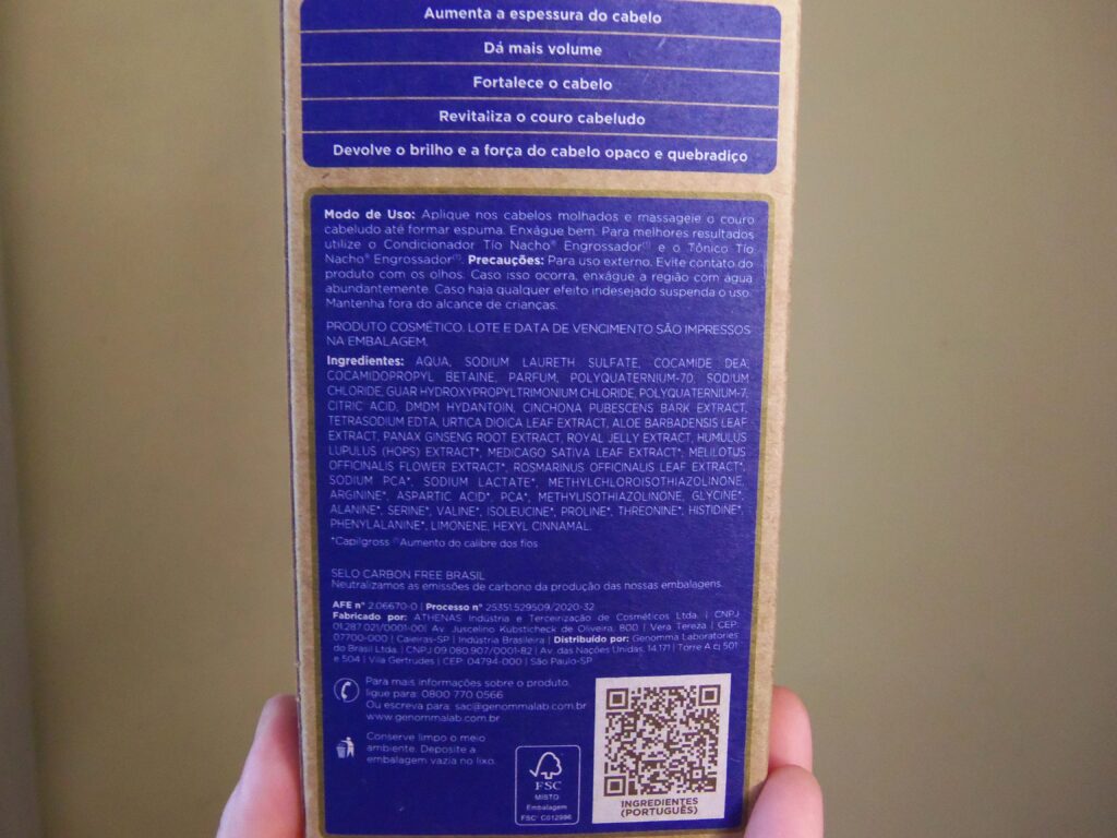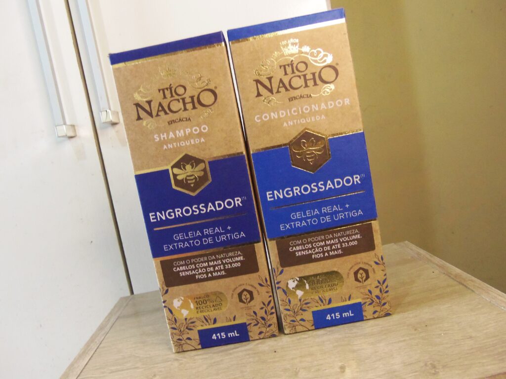 Depois de tanto ouvir e ler sobre, enfim, me joguei no shampoo e condicionador da Tío Nacho. A variação escolhida foi a Engrossador com geleia real + extrato de urtiga e são itens antiqueda.