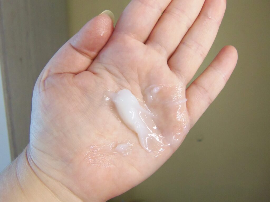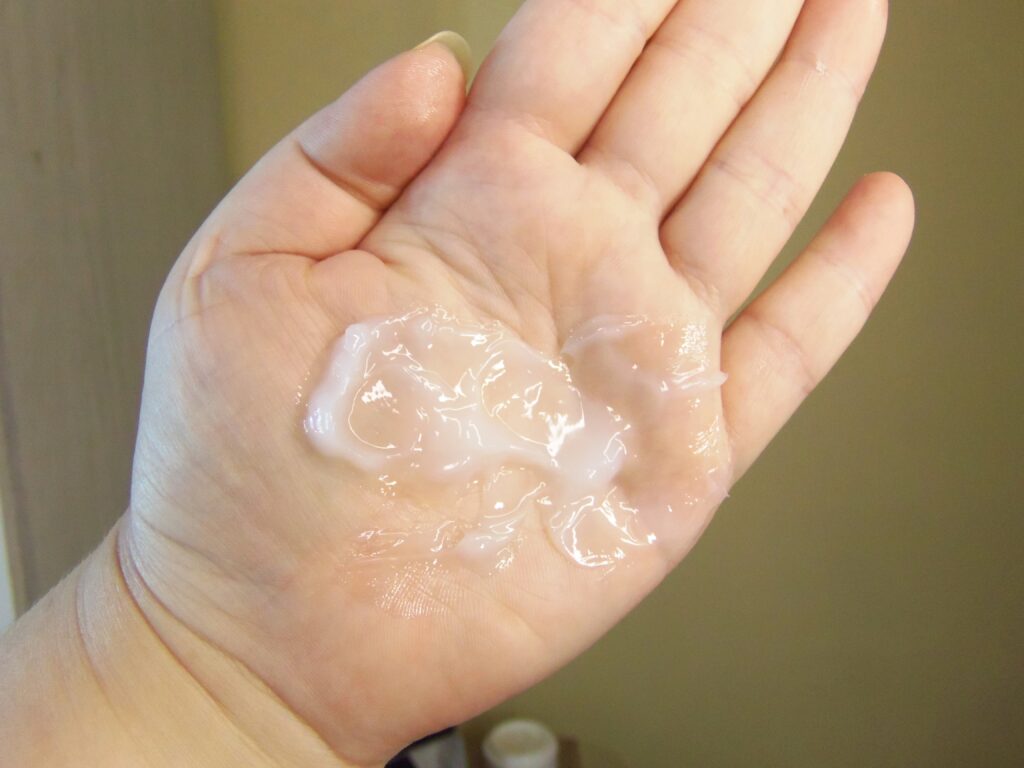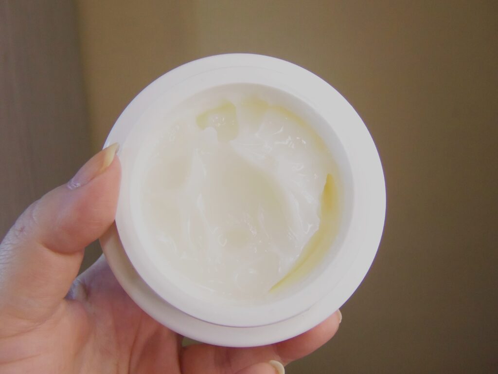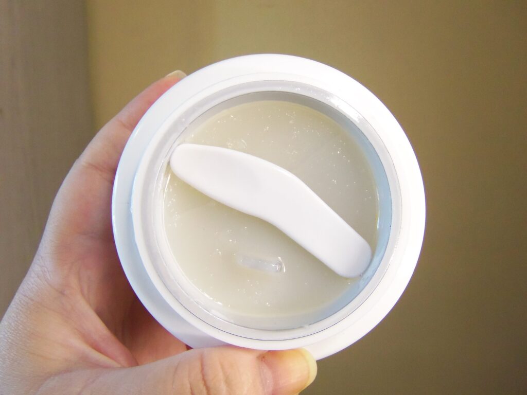 O mesmo possui textura cremosa indo para a gelatinosa, branca e leve. Um pouco é suficiente para utilização e é necessário uma espátula, inclusive vem uma junto com o produto ou os dedos para retirar o creme.