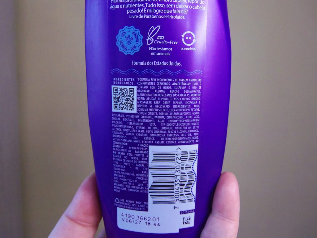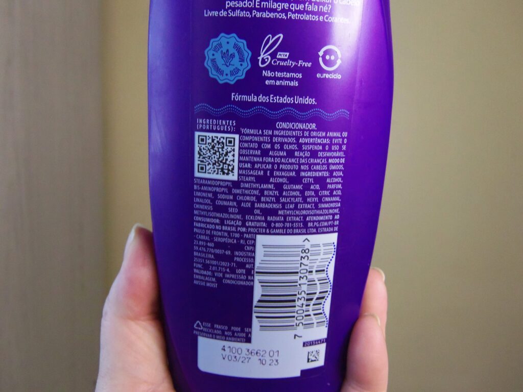 As informações gerais do item e os ingredientes são facilmente encontrados e lidos nas partes de trás dos frascos e também no site oficial da marca nas páginas individuais tanto do shampoo quanto do condicionador.