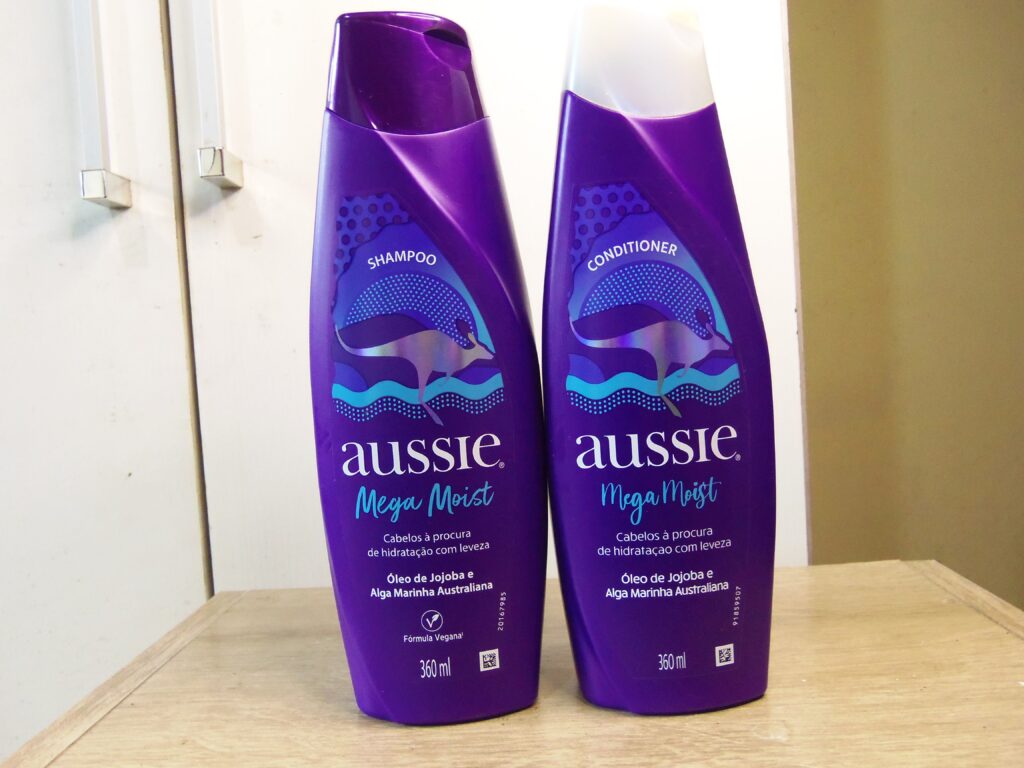 Shampoo e Condicionador Mega Moist / Aussie / 360 ml cada / Shampoo: R$ 59,90 – Condicionador: R$ 59,90 / ☆☆☆☆☆