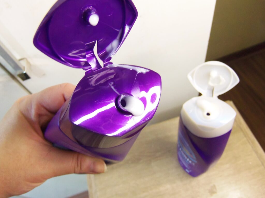 Ambos são de plásticos com detalhes em variados tons de roxo e azul, branco e com o desenho do famoso canguru da marca desenhado nas frentes dos frascos combinando com uma paisagem com montanhas e águas. As tampas abrem e fecham e as saídas são médias. Já para acessar as texturas é necessário retirar as tampas principais, são fáceis de serem abertas e as saídas são grandes.